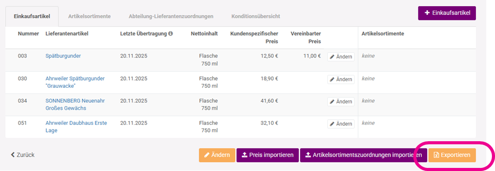 Durch den Button “Exportieren” wird ein XLS-Export deines Einkaufskataloges gestartet: