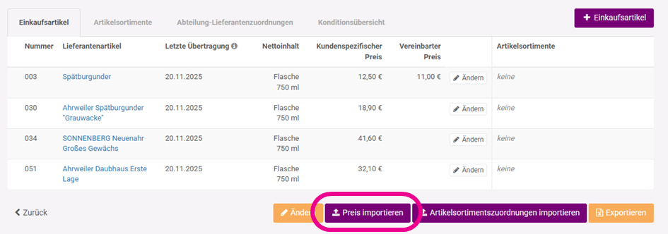Bitte beachte: der Preisimport und die Artikelsortimentszuordnungen per XLS-Datei sind getrennte Funktionen.