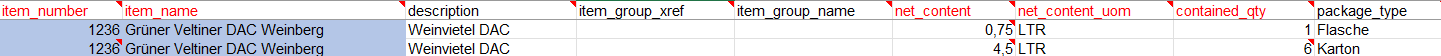 contained_qty | Anzahl der enthaltenen Einheiten des Basisartikels Einzelartikel = 1 bei unterschiedlichen Gebinden entsprechend anpassen (z.B. Kiste mit 6 Flaschen = 6) |