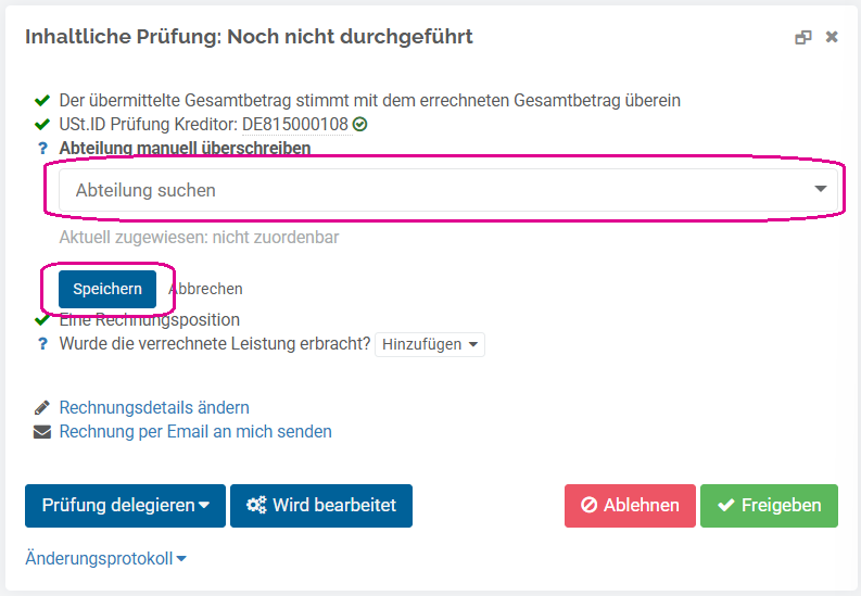 Rechnungsdashboard → Alle Prüfen → Abteilung Ändern → Eingabe bei Abteilung suchen → Speichern → ggf. Prüfung delegieren