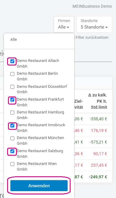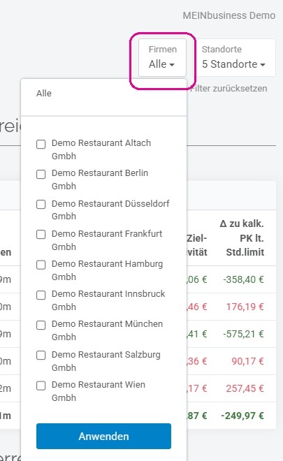 Möchtest du nur bestimmte Firmen dir anzeigen lassen, dann setze mit der Maus bei den gewünschten Firmen das Häkchen. Um die Auswahl zu bestätigen, drücke auf den Button “Anwenden”