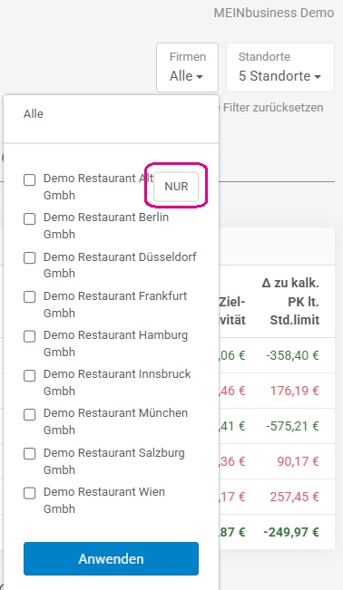 Möchtest du dir nur eine Firmen dir ansehen, dann gehe mit der Maus zum Firmenname. Rechts daneben erscheint das Wort “NUR”. Klicke auf “NUR” und der Filter wird automatisch übernommen.
