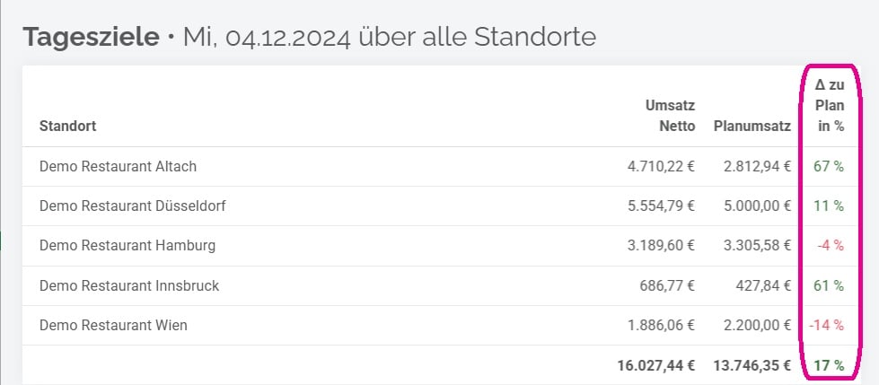 Bei einer grünen Prozentzahl ist der Umsatz höher als dein Planumsatz, bei einer roten Prozentzahl ist der Umsatz netto niedriger als dein Planumsatz.