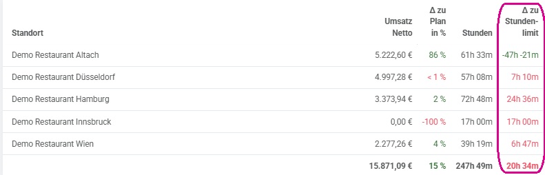 Die Stundenabweichung zeigt, ob dir ob du mehr oder weniger Stunden als dein Stundenlimit erlaubt, eingeteilt hast.