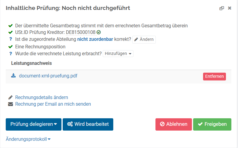 Wurde vom Lieferanten ein Leistungsnachweis, beispielsweise ein Lieferschein, per E-Mail übermittelt, kann dieser in der inhaltlichen Prüfung zur Sicherstellung der Vollständigkeit und Nachvollziehbarkeit angehängt werden.