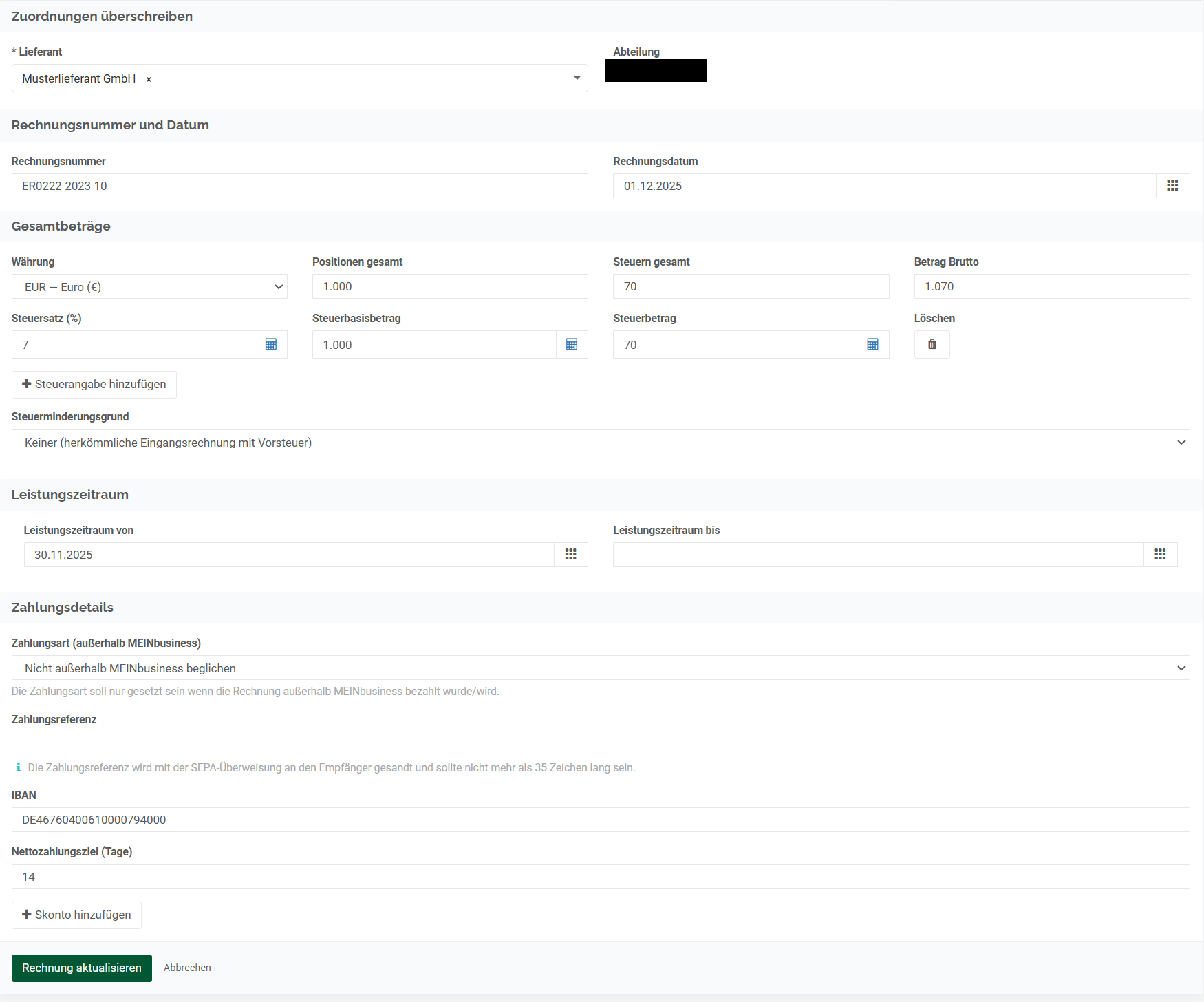Rechnungsdaten ändern, wie Beträge, Abteilung,