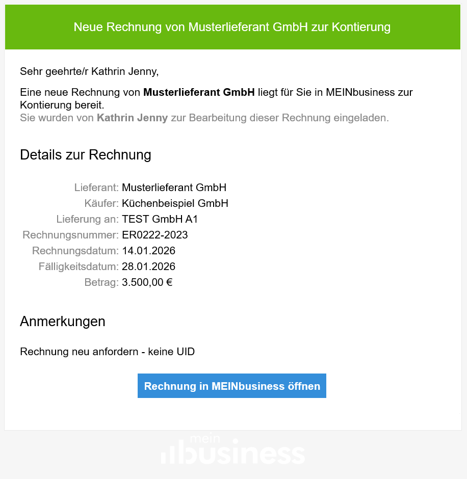 Der User, an den die Rechnung delegiert wurde, erhält eine E-Mail mit folgenden Informationen: