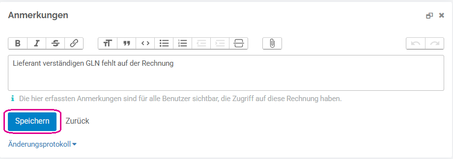 Anmerkungen: Bevor die Kontierung delegiert wird, muss im Notizfeld eine Anmerkung eingetragen werden, z. B. warum die Rechnung weitergeleitet wird und welche Punkte geprüft oder geändert werden müssen.