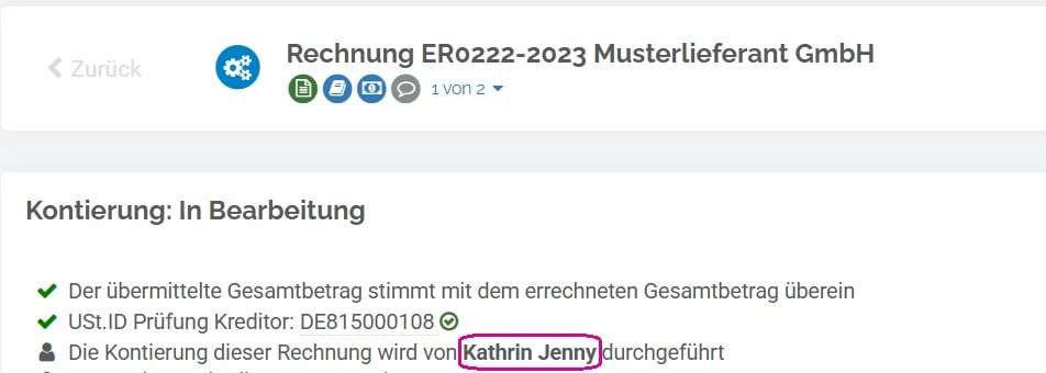 Status: Nach der Delegation erhält die Rechnung den Status „In Bearbeitung“.