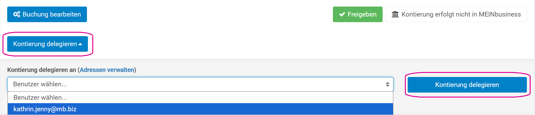 Delegation: Die Rechnung kann an den User delegiert werden, der für die Kontierung zuständig ist.