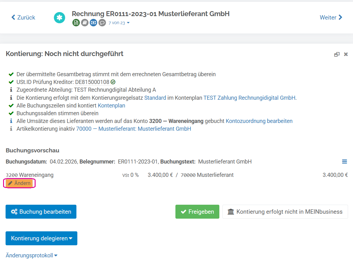 Handelt es sich lediglich um einen einmaligen Sonderfall, der eine Anpassung in der Buchungsvorschau erforderlich macht, kann die Kontierung über den Button „Ändern“ in der Kontierungsvorschau – wie oben beschrieben – angepasst und die Rechnung anschließend freigegeben werden.