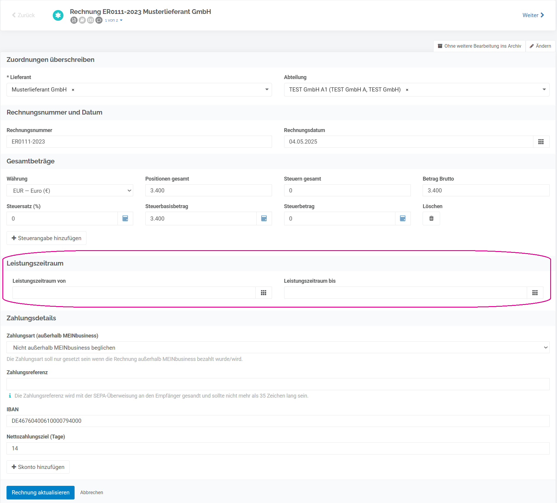 Wird das Lieferdatum bzw. der Leistungszeitraum zwar aufgedruckt, aber nicht ausgelesen → Ticket an MEINbusiness erstellen.