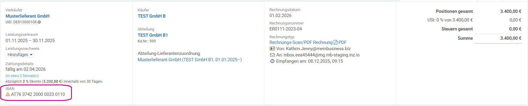 MEINbusiness liest den IBAN aus der Rechnung aus und gleicht ihn mit den in den Lieferantenstammdaten hinterlegten IBANs ab.