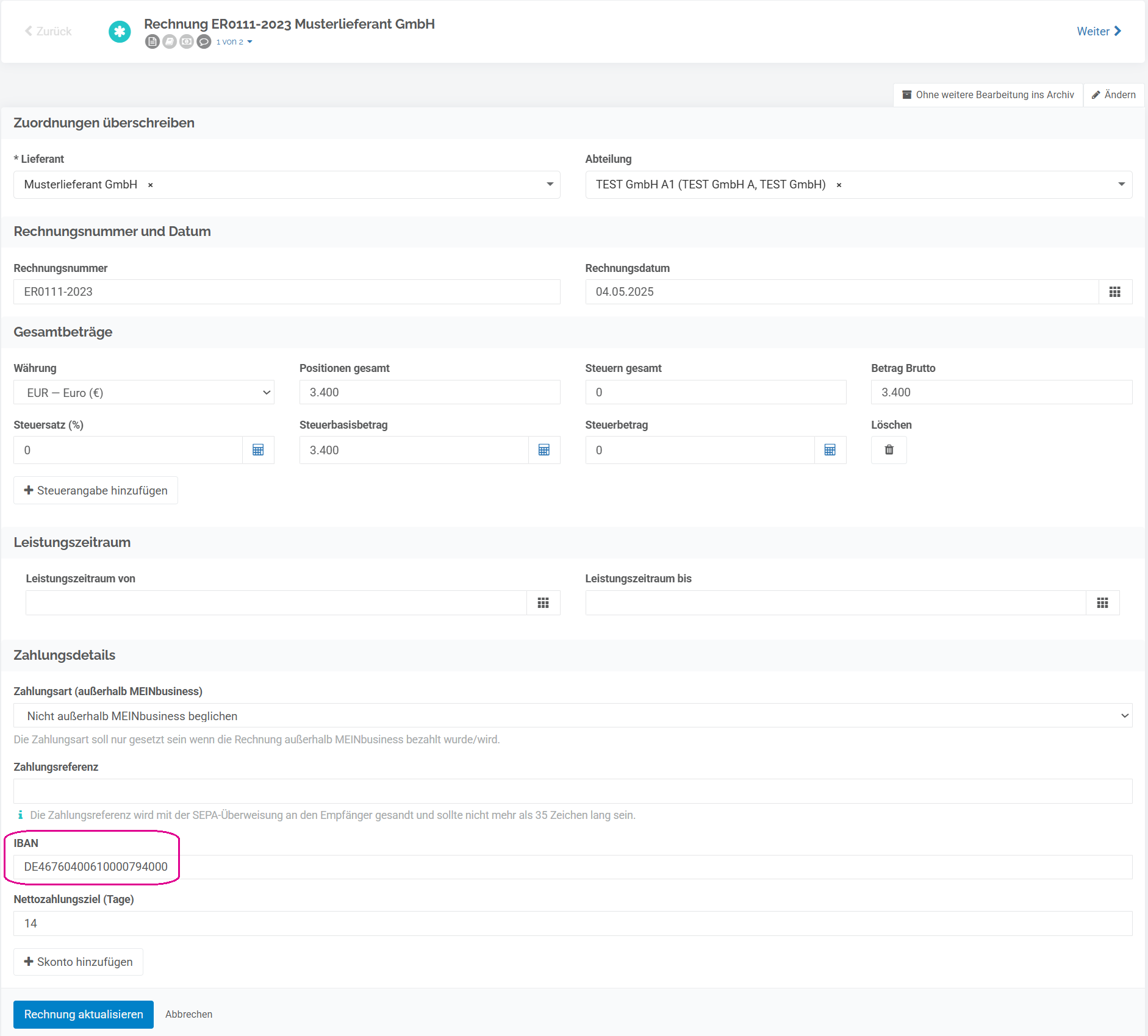 Der geänderte IBAN wird automatisch für zukünftige Rechnungen dieses Lieferanten in der jeweiligen Abteilung in der Abteilung-Lieferanten-Zuordnung hinterlegt.