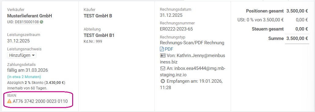 Das Nettozahlungsziel sowie ein möglicher Skonto werden automatisch ausgelesen, wenn diese auf der Rechnung unter definierten Kriterien angedruckt sind oder vom Lieferanten elektronisch mitgesendet werden.