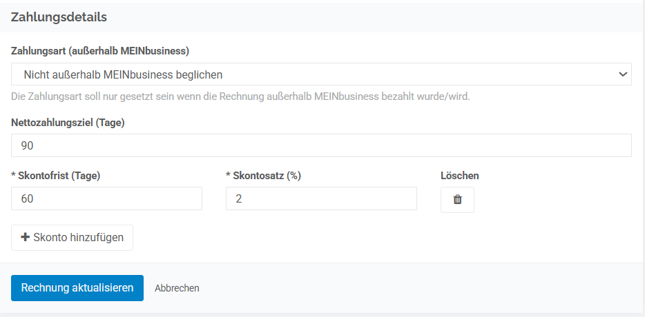 „Skonto 3 % bei Zahlung bis 15.03.2026“