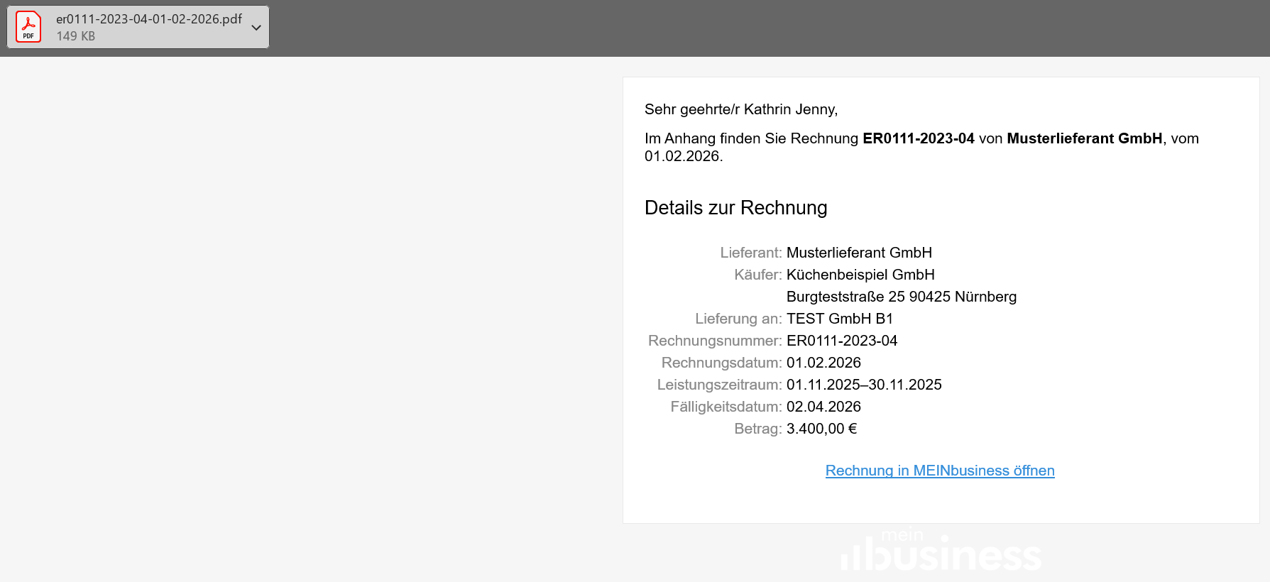 Eine Rechnung kann direkt aus MEINbusiness an die E-Mail des angemeldeten Benutzers gesendet werden. Diese Funktion dient insbesondere der Lieferantenkommunikation, z. B. wenn noch offene Punkte mit dem Lieferanten geklärt werden müssen.