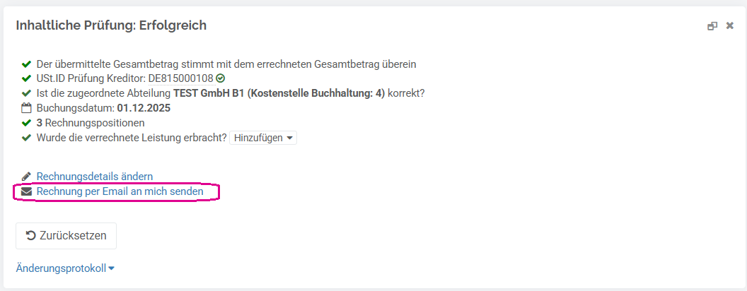 Im Prozessschritt Inhaltliche Prüfung kann eine Rechnung mit der Funktion „Rechnung per E-Mail an mich senden“ an den aktuell angemeldeten Benutzer gesendet werden.