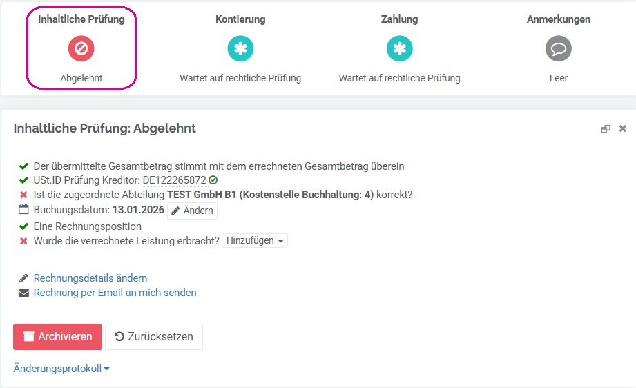 Die Rechnung bleibt im Status „Abgelehnt“, bis entschieden wurde, wie weiter mit ihr verfahren wird.