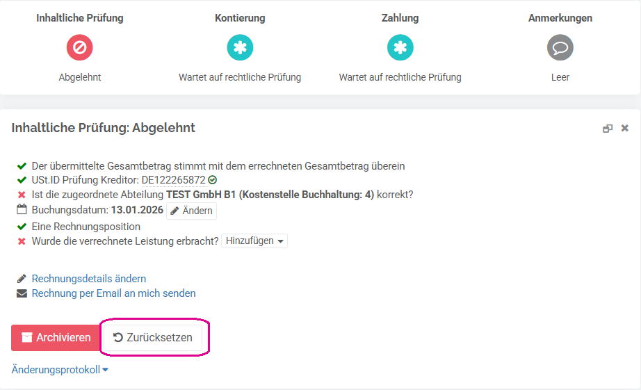 Wird entschieden, eine abgelehnte Rechnung doch weiter zu verarbeiten, kann die Ablehnung zurückgesetzt werden.