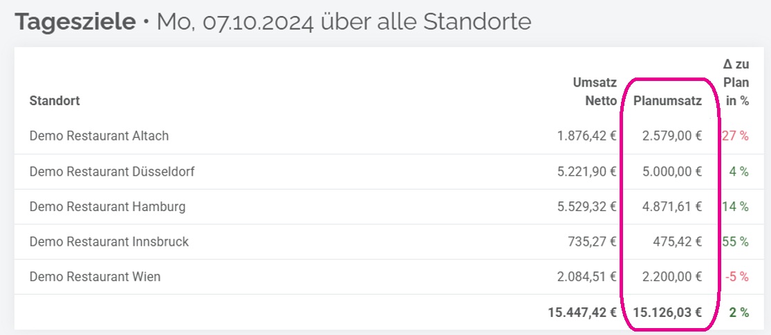 Der Planumsatz des Tagesziel kann auf zwei Varianten dargestellt werden.