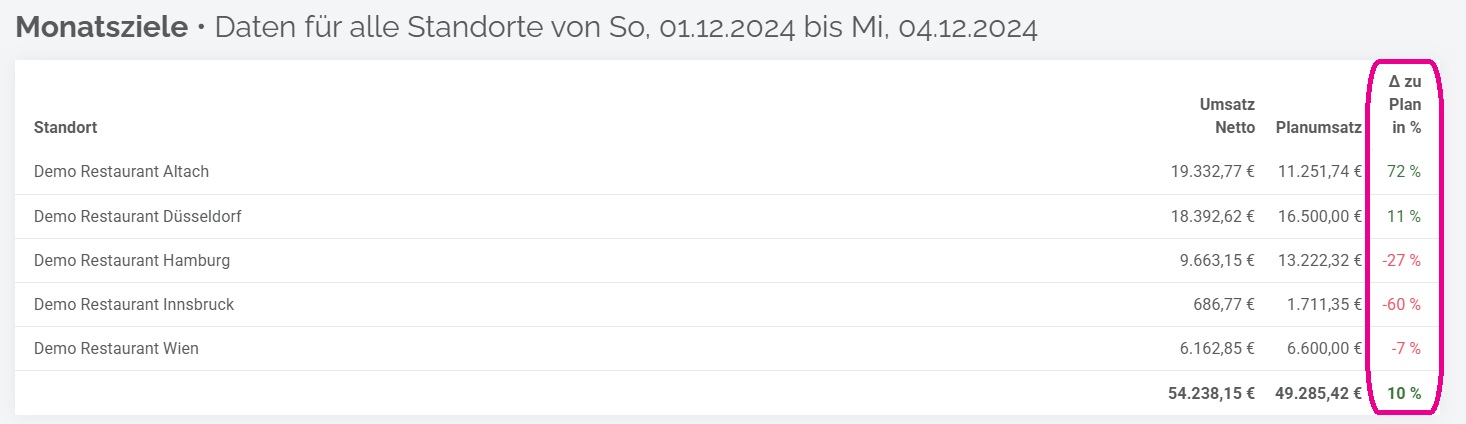 Bei einer grünen Prozentzahl ist der Umsatz höher als dein Planumsatz, bei einer roten Prozentzahl ist der Umsatz netto niedriger als dein Planumsatz.