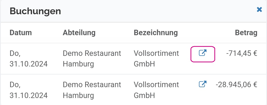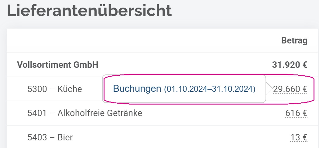 Mit Mausover über den Konten-Betrag können die einzelnen Buchungen bzw. Rechnungen angezeigt werden. Wenn auf “Buchungen” geklickt wird öffnet sich ein neues Fenster mit den einzelnen Buchungszeilen. Diese führen zu den einzelnen Rechnungen des Lieferanten.