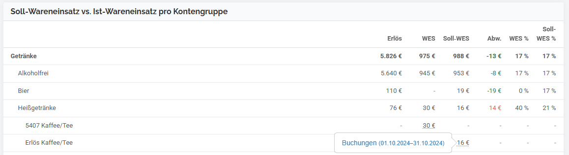 Diese Tabelle zeigt auf einen Blick die Erlöse aus deiner Kasse, deinen Wareneinsatz aus Lieferantenrechnungen und den Soll-Wareneinsatz pro Kontogruppe.