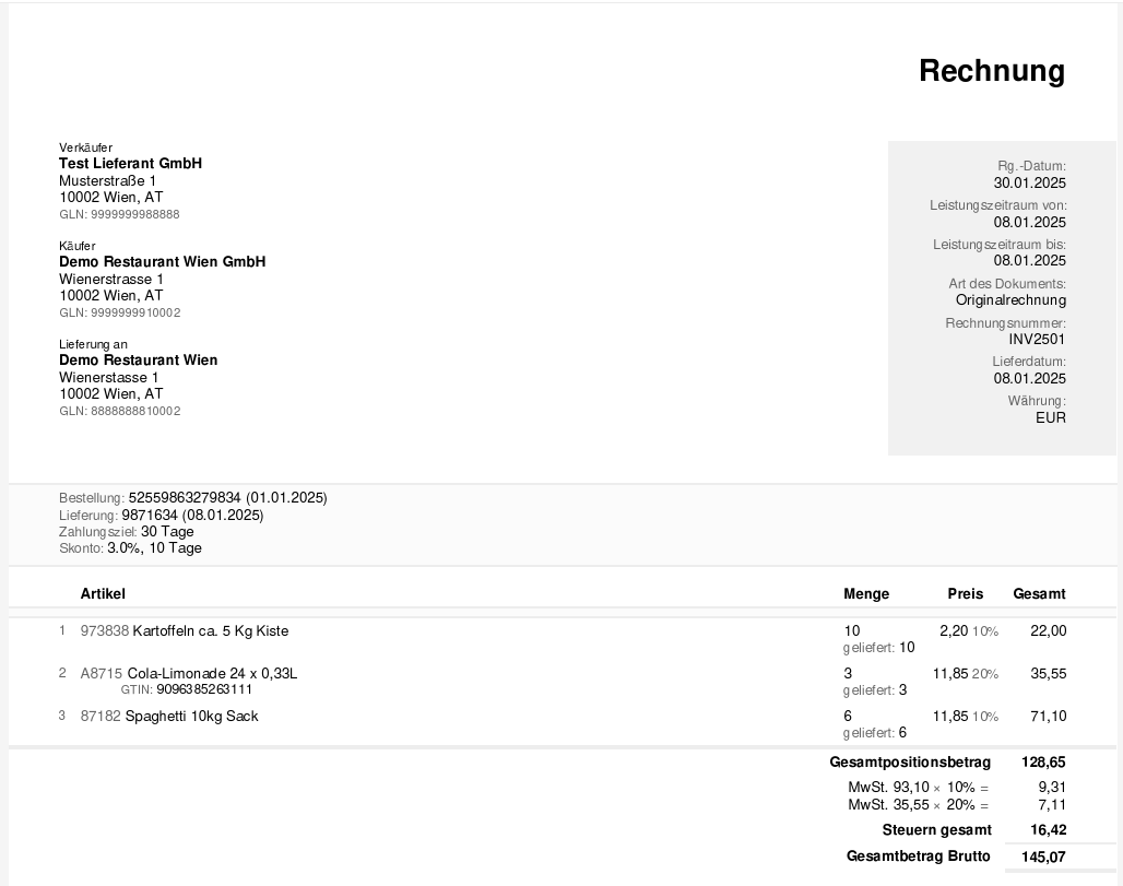 Für EDI- und XRechnungen erstellt MEINbusiness ein menschenlesbares PDF, das alle übermittelten Daten unverfälscht widerspiegelt. Es erfolgen keinerlei Ergänzung, Anpassung oder Veränderung der Rechnungsdaten.