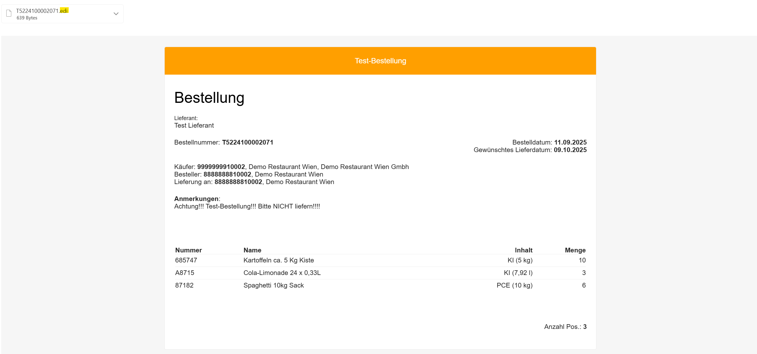 Bestellung: Die Artikel aus dem Artikelstamm werden eins zu eins in der Bestellung übermittelt.