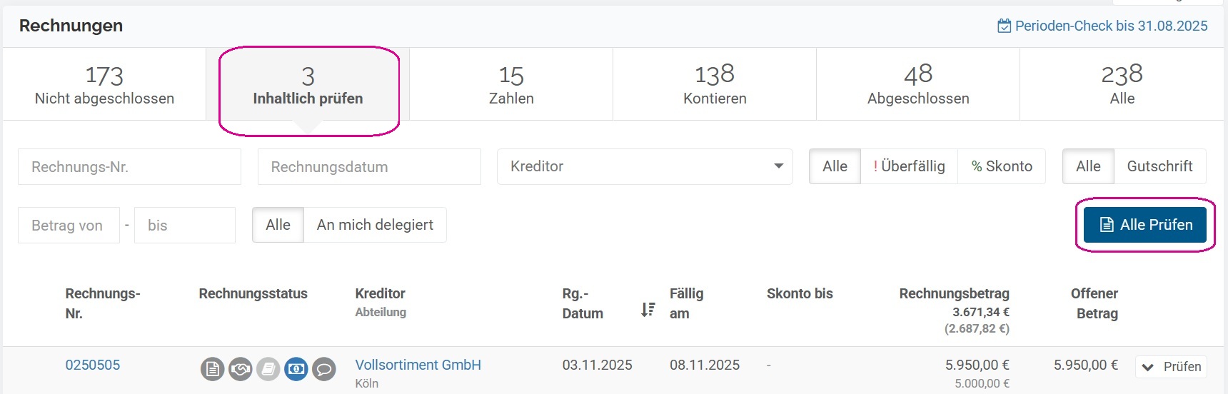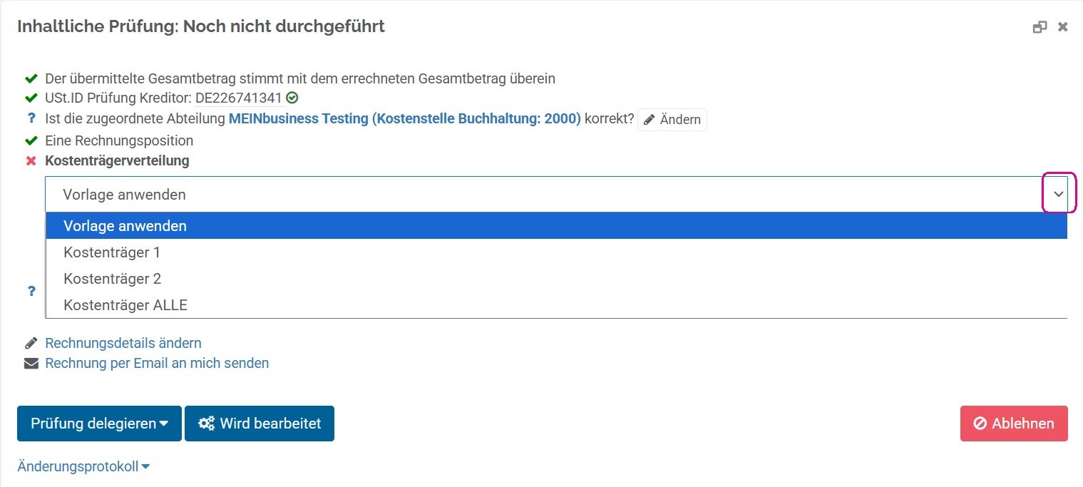 Rechnungsdashboard → Inhaltliche Prüfung → „Alle Prüfen” → Kostenträgerverteilung „Hinzufügen” → Drop down → Auswahl einer Kostenträger Split-Vorlage