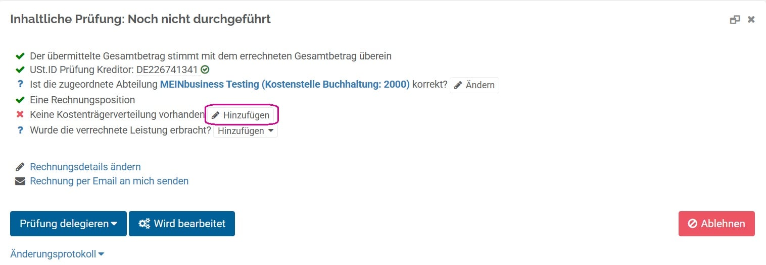 Ohne Zuordnung einer Kostenträgerverteilung, kann die Rechnung in der inhaltlichen Prüfung nicht freigegeben werden.