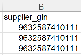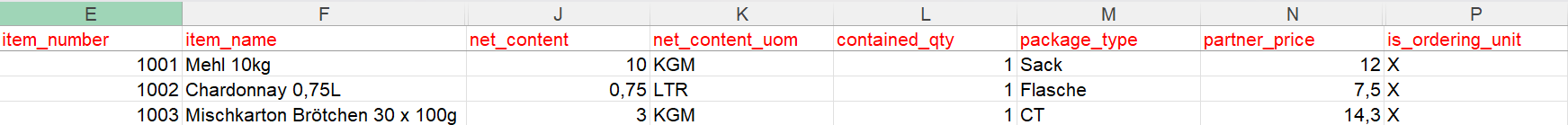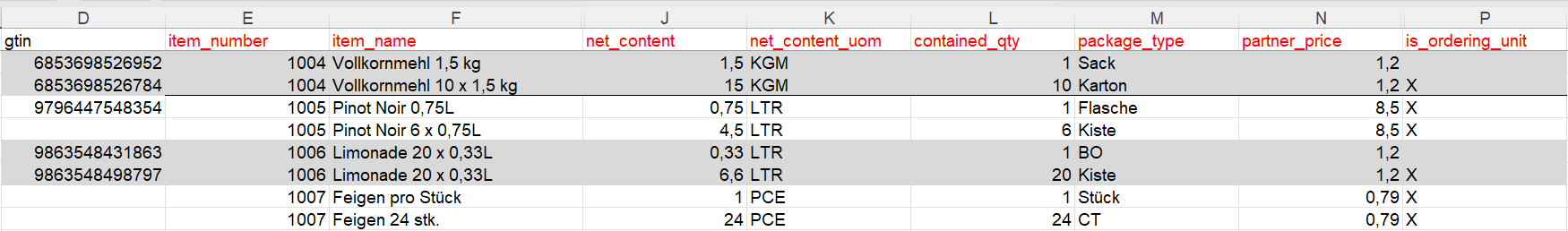 Für jede Zeile, die einen Artikel enthält, muss die supplier_gln wiederholt werden.