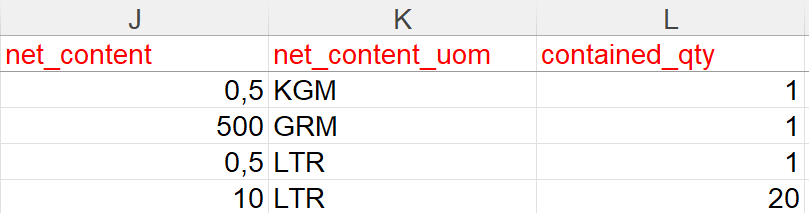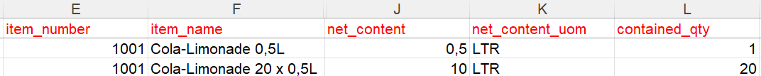 Die kleinste Einheit wird bei gleicher Artikelnummer mit contained_qty = 1 und die Übereinheit mit den Anzahl an Verbrauchereinheiten angegeben.