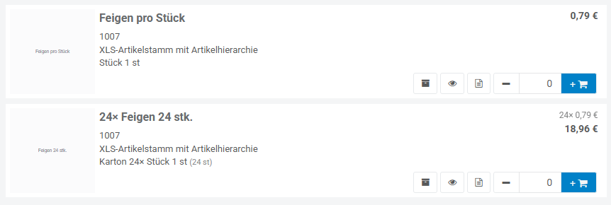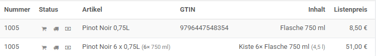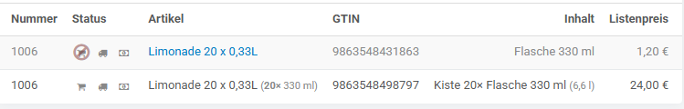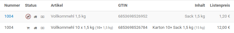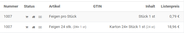 Auch wenn für die gleiche Artikelnummer zwei Einheiten verfügbar sind, muss sich der GTIN unterscheiden.