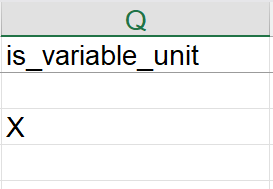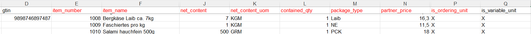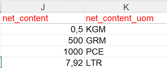 Wird in Spalte net_content_uom der Wert PCE oder H87 angegeben, darf in Spalte is_variable_unit kein “X” gesetzt werden.