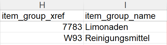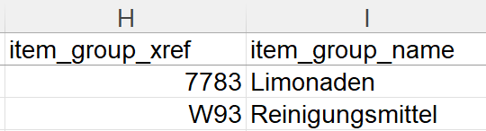 Wird eine Warengruppenbezeichnung angegeben, ist die Spalte item_group_xref verpflichtend auszufüllen.