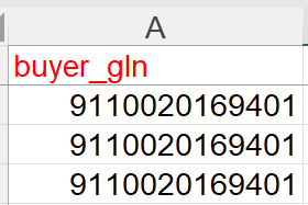 Für jede Zeile, die einen Artikel enthält, muss die buyer_gln wiederholt werden.