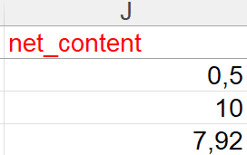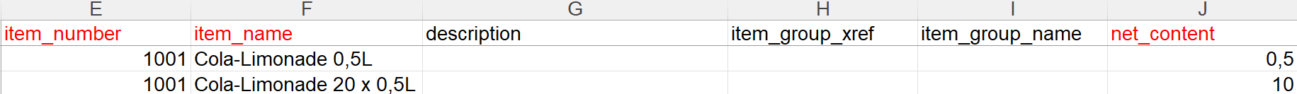 net_content: Nettofüllmenge pro Einheit (muss sich innerhalb einer Artikelnummer unterscheiden)