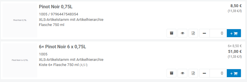 Ein Wein ist sowohl als Flasche als auch als Karton bestellbar, fakturiert wird pro Flasche.