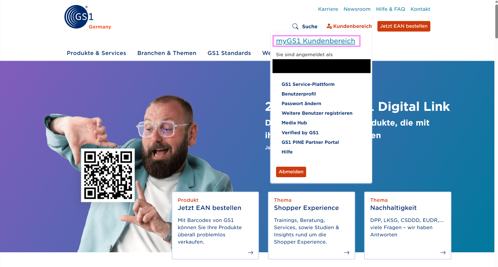 Als Nächstes muss in den GS1 Kundenbereich gewechselt werden. Dies erfolgt mit einem klick auf “myGS1 Kundenbereich”