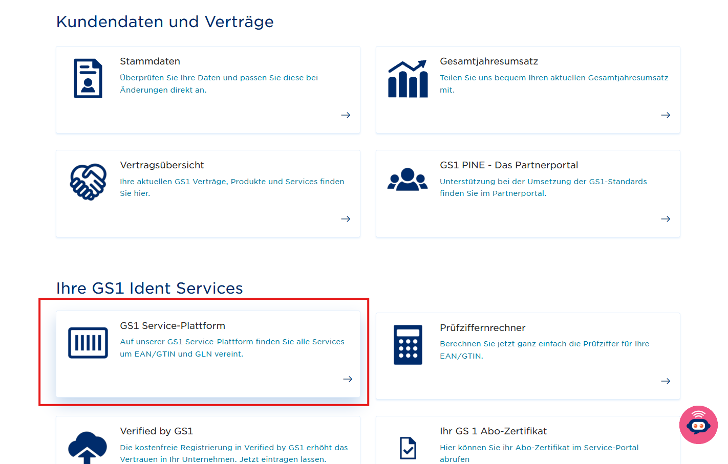 Dazu muss ein Stück nach unten gescrollt werden, um im Bereich “Ihre GS1 Ident Services auf GS1 Service-Plattform” geklickt werden.