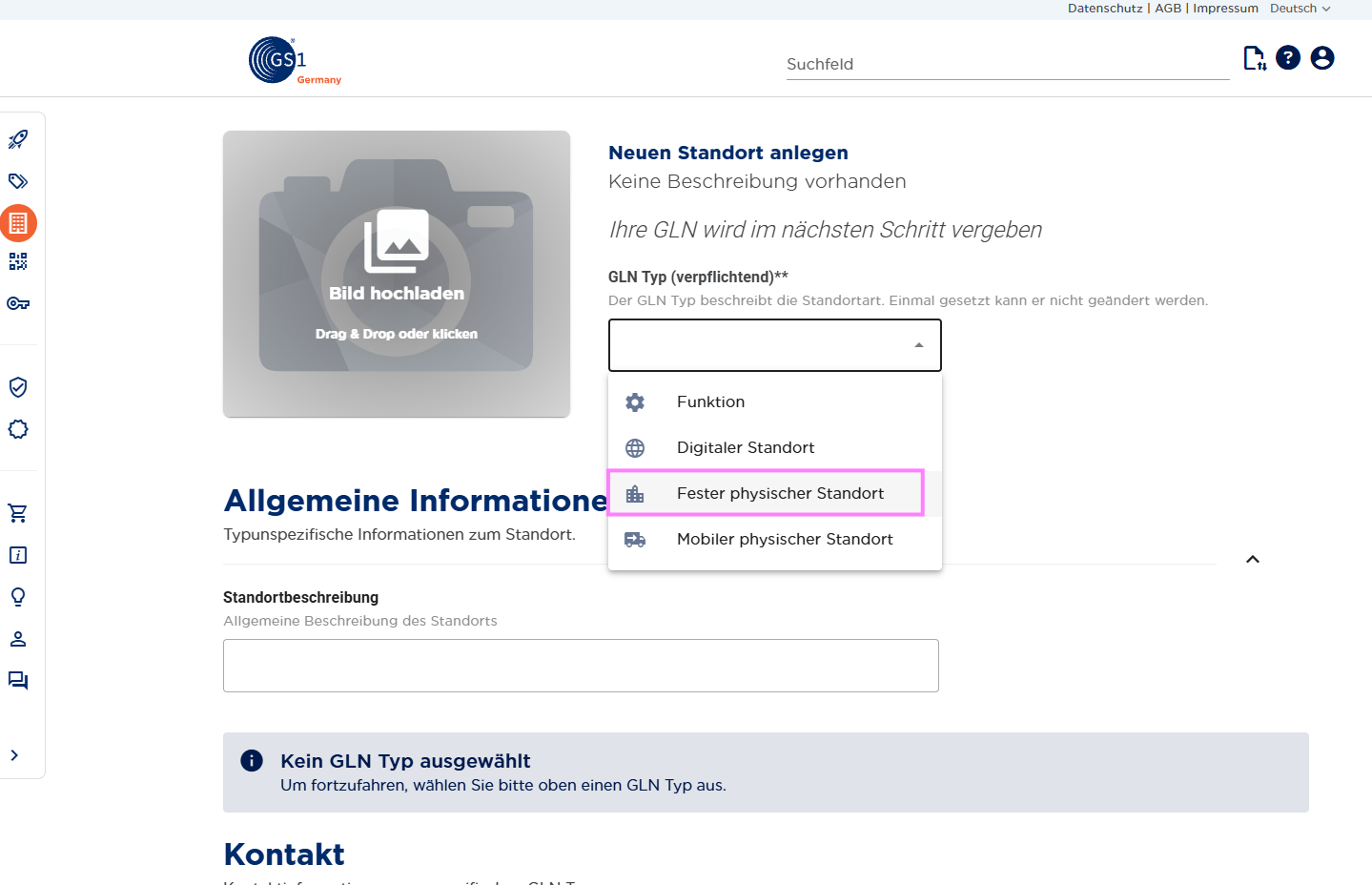 Bei GLN Typ bitte immer “Fester physischer Standort” auswählen