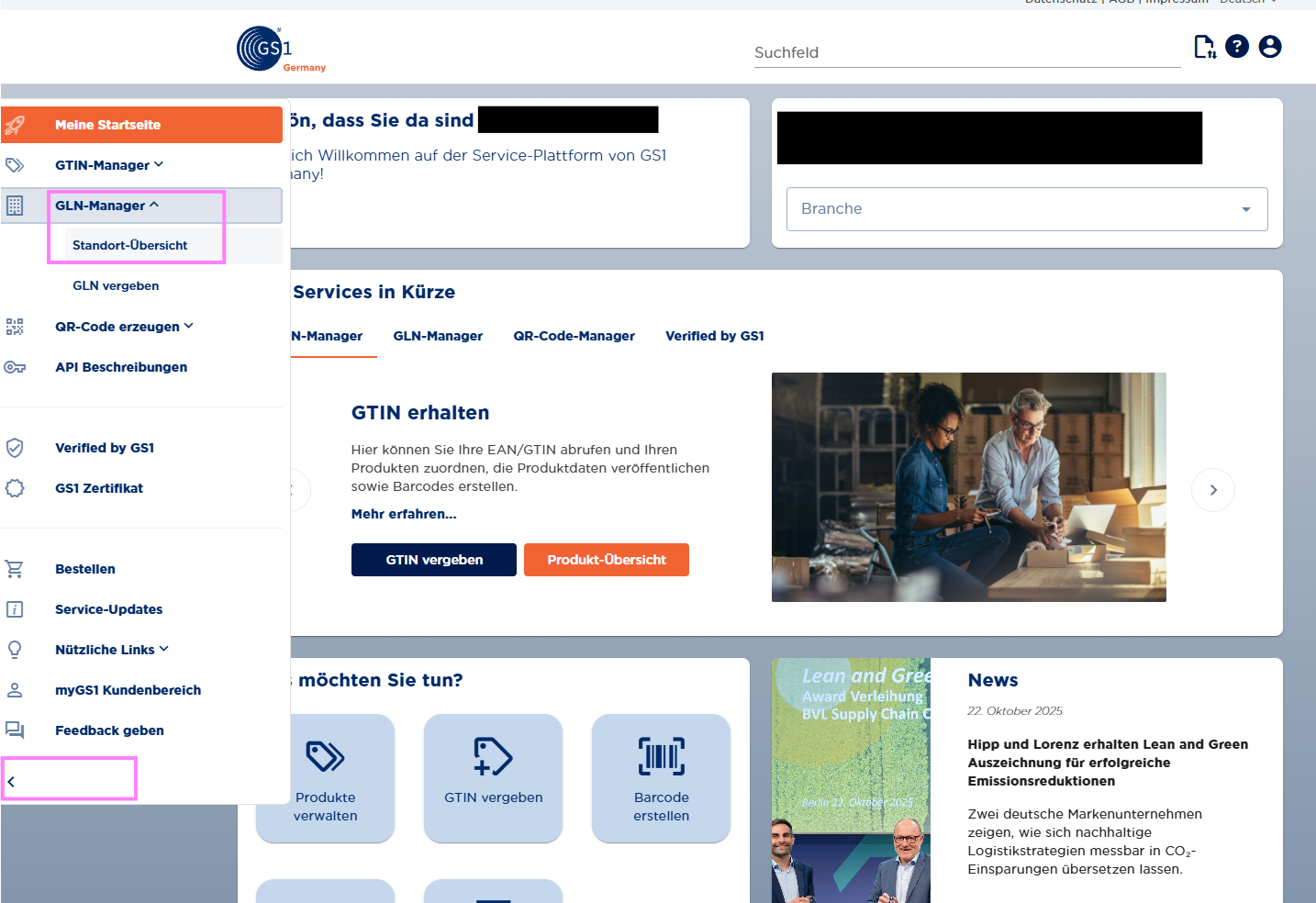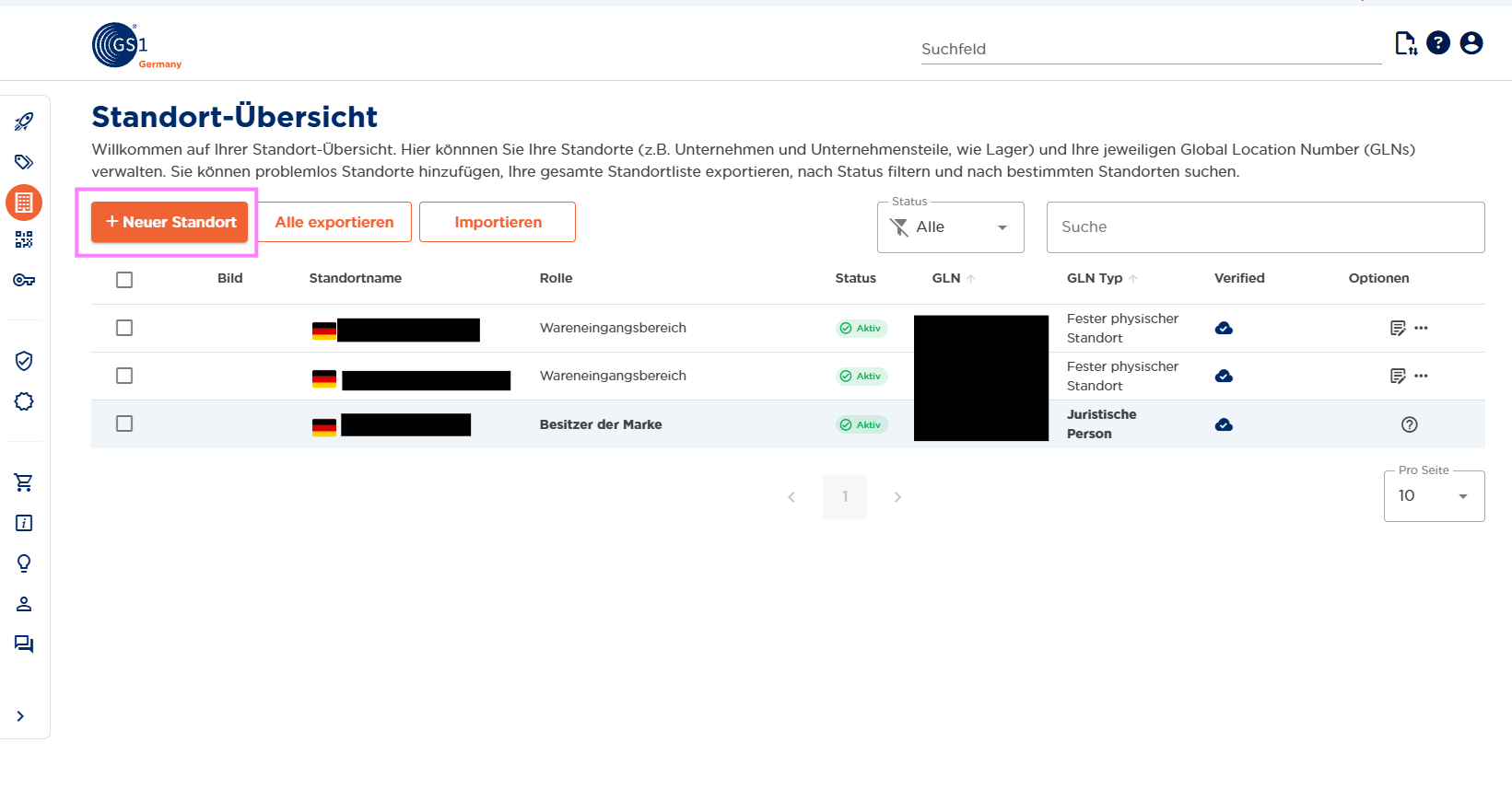 Nun kann ich die Seitenleiste öffnen und beim Punkt “GLN-Manager” auf die Standort-Übersicht klicken und komme nun zur Übersicht der Standorte