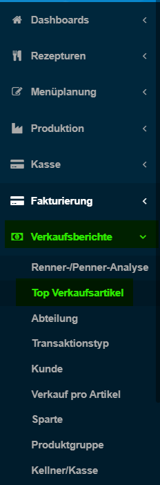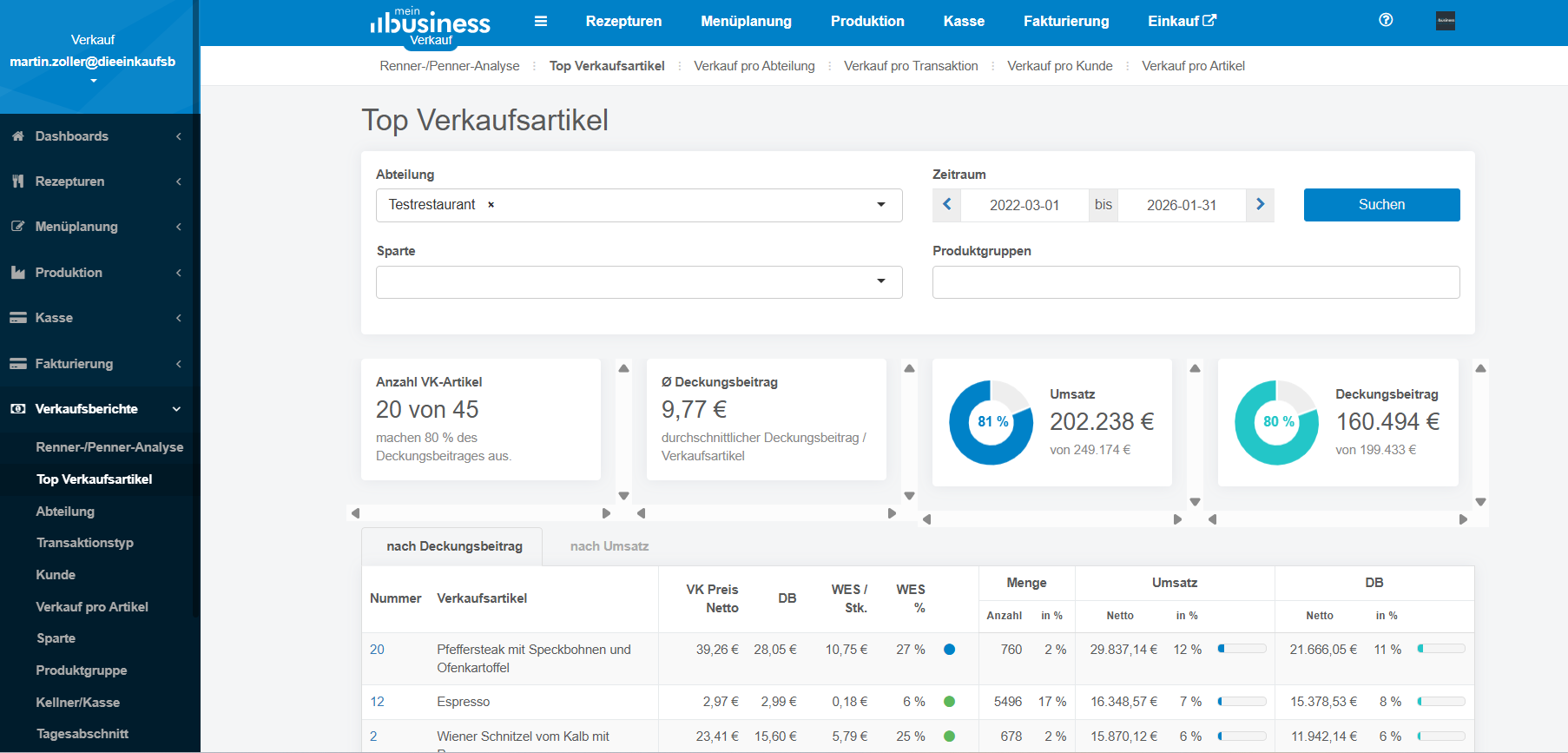 Die „Top-Verkaufsartikel“ zeigen – wie der Name bereits sagt – jene Artikel innerhalb der gewählten Parameter (Zeitraum, Sparte, Produktgruppe) an, die zusammen 80 % des Umsatzes bzw. des Deckungsbeitrags ausmachen.