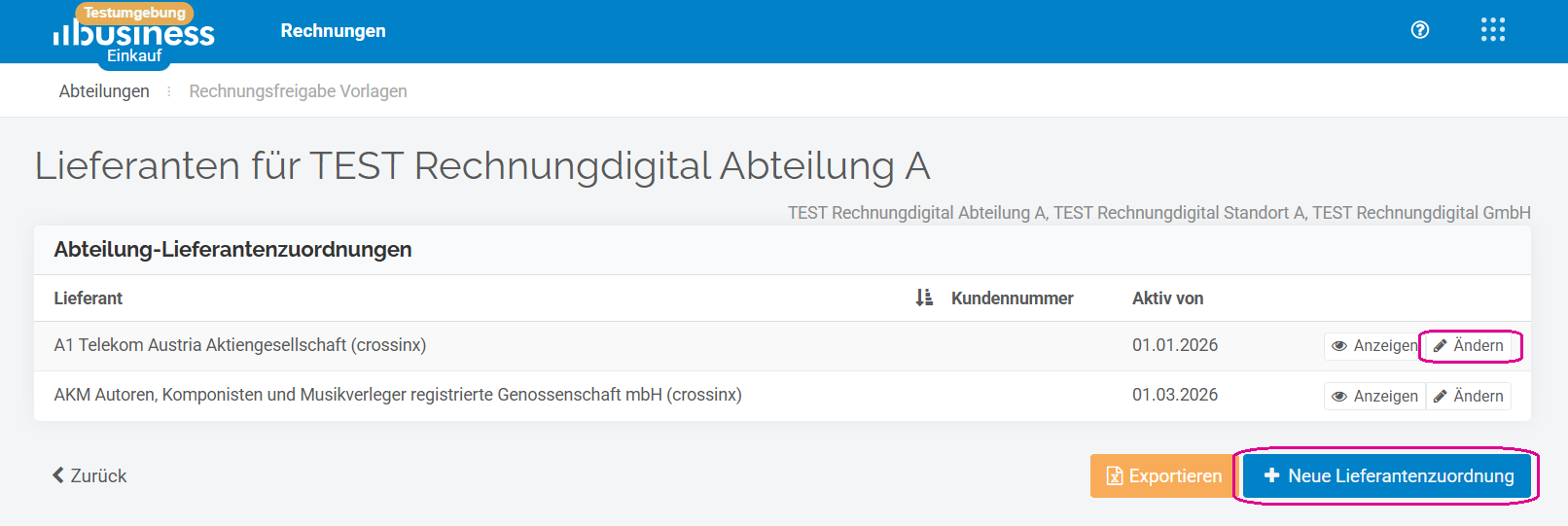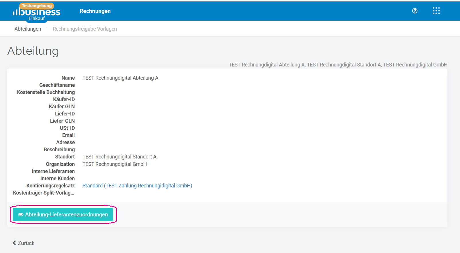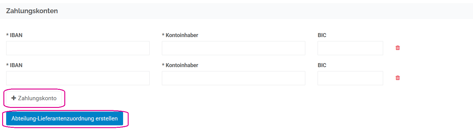 Rechnungsdashboard → Menü→ Stammdaten → Auswahl Abteilung ‘Anezigen’ → Abteilungs-Lieferantenzuordnung → +Neue Lieferantenzuordnung/’Ändern’ bestehende Lieferantenzuordnung → +Zahlungskonto → Abteilungs-Lieferantenzuordnung erstellen