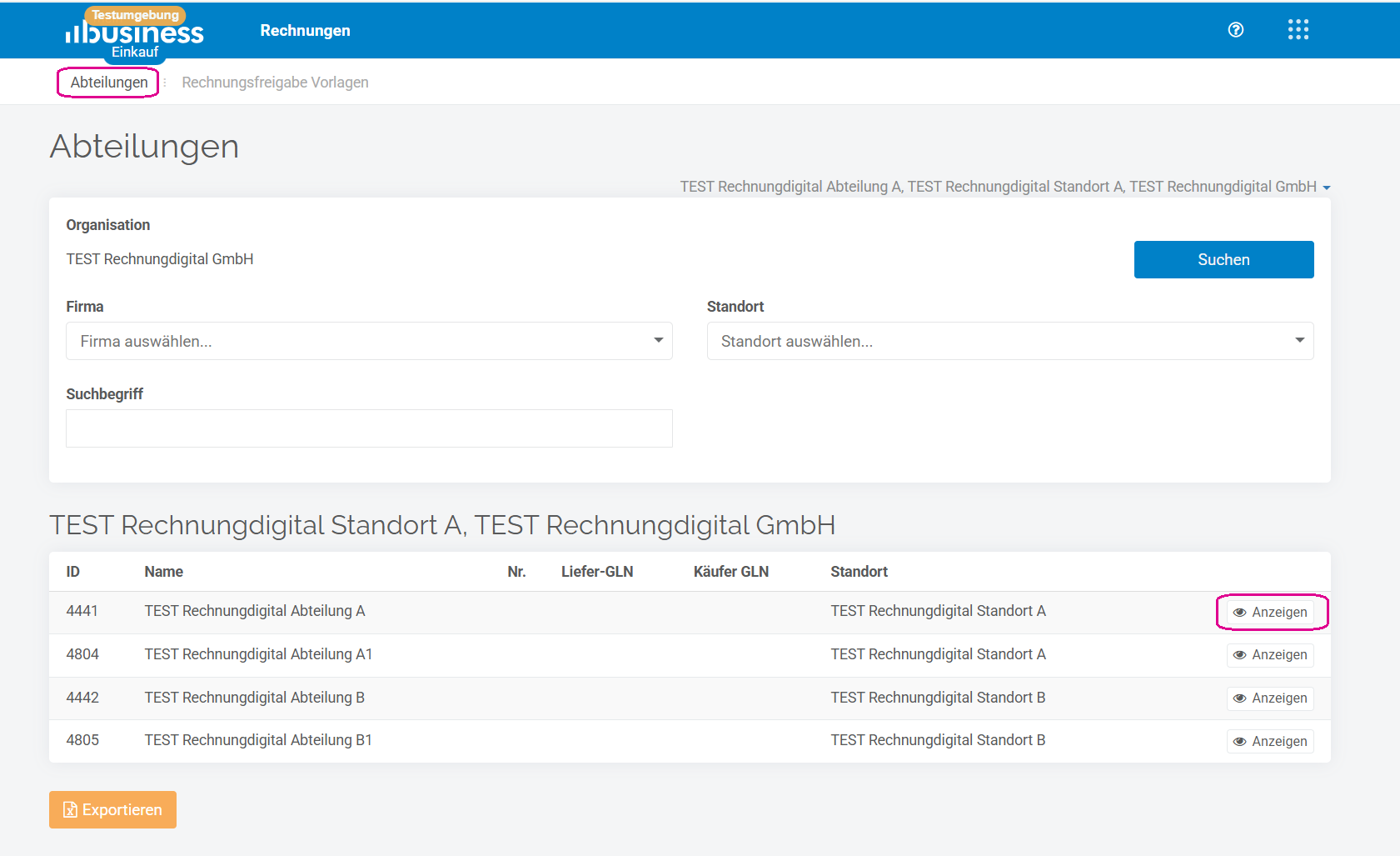 Zugriff auf die Stammdaten auf Abteilungsebene haben ausschließlich Organisationsadministratoren und Firmenadministratoren.