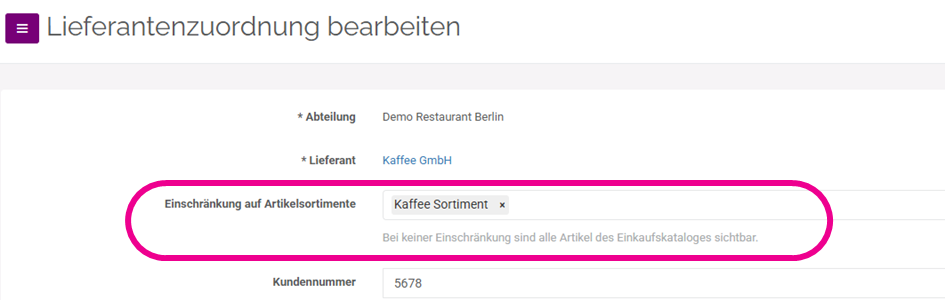 Das Sortiment kann ebenfalls im Bearbeitungsmodus der Abteilungs-Lieferantenzuordnung hinterlegt werden: