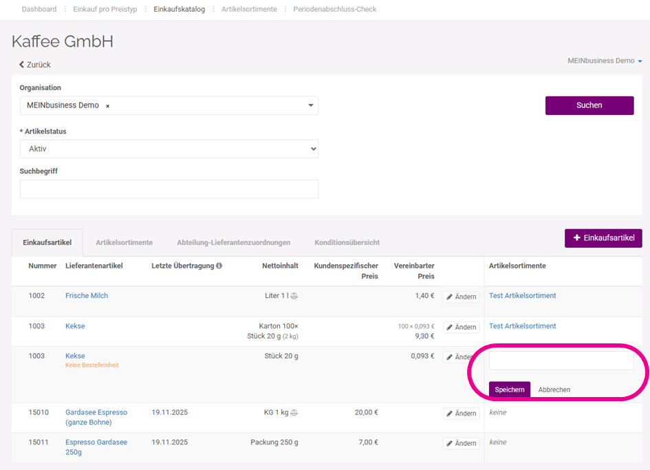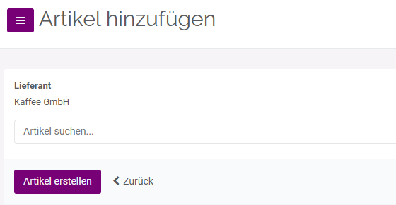 Wähle einen deiner Lieferanten im Einkaufskatalog aus und gehe in die Übersicht deiner Einkaufsartikel.