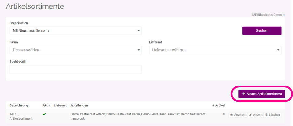 Mit dem Button "+ neues Artikelsortiment” kannst du eine neue Eingrenzung erstellen: